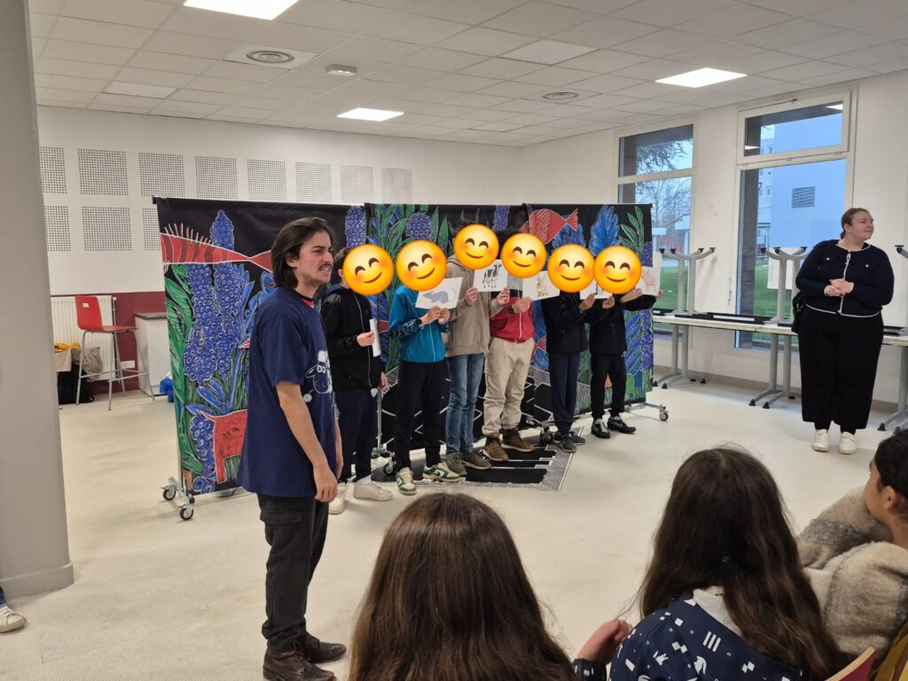 La matinée s’est clôturée par un travail de groupe où les élèves devaient lire, puis jouer le début d’un sketch, proposé parfois par la troupe.