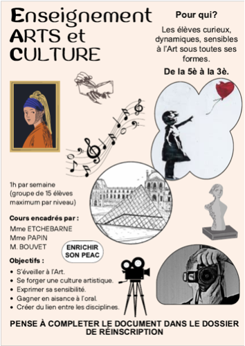 Cette option, encadrée par Mme Etchebarne, Mme Papin et M. Bouvet, permet d’enrichir son PEAC (Parcours d’Éducation Artistique et Culturelle), de développer sa sensibilité artistique et sa culture générale. Les élèves y apprennent à observer et analyser des œuvres, tout en créant des liens entre les disciplines. Cela leur permet aussi de se constituer un potentiel choix de sujets d’EAC et d’Histoire des Arts vers lesquels ils pourront se tourner pour leur oral du Brevet.